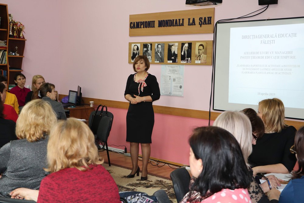 În data de 10 aprilie 2019, în incinta Casei de Creaţie şi Agrement pentru copii şi Tineri „Lora Găină”, Făleşti, Direcţia Generală Educaţie, a organizat şi desfăşurat un atelier de lucru pentru managerii instituţiilor de educaţie timpurie. Obiectivele atelierului au fost: „Formarea deprinderilor managerilor instituţiilor de educaţie timpurie, în elaborarea unui Plan/Raport şi dezvoltarea simţului responsabilităţii managerului în elaborarea Raportului /Planului, ca element de asigurare a unui management efectiv şi de calitate. S-a lucrat în grupuri, împreună cu specialiştii şi Şefa DGE Făleşti, la elaborarea unei mostre de plan de activitate a instituţiei de învăţământ în baza Ordinului MECC nr.970 din 11 octombrie 2013.
