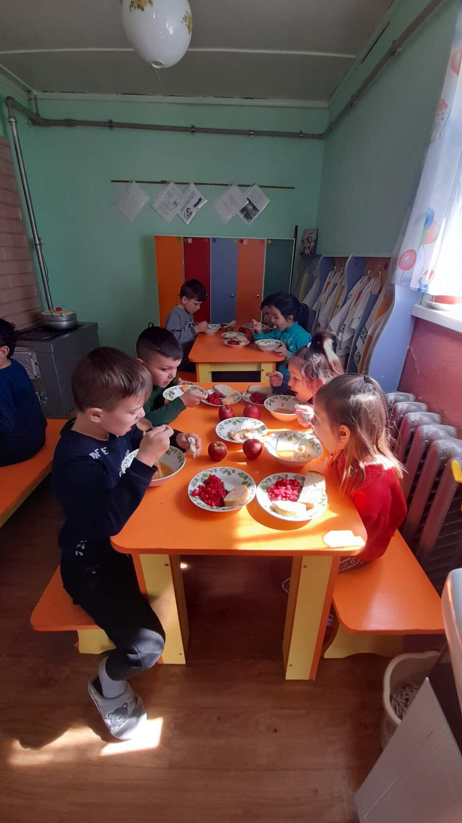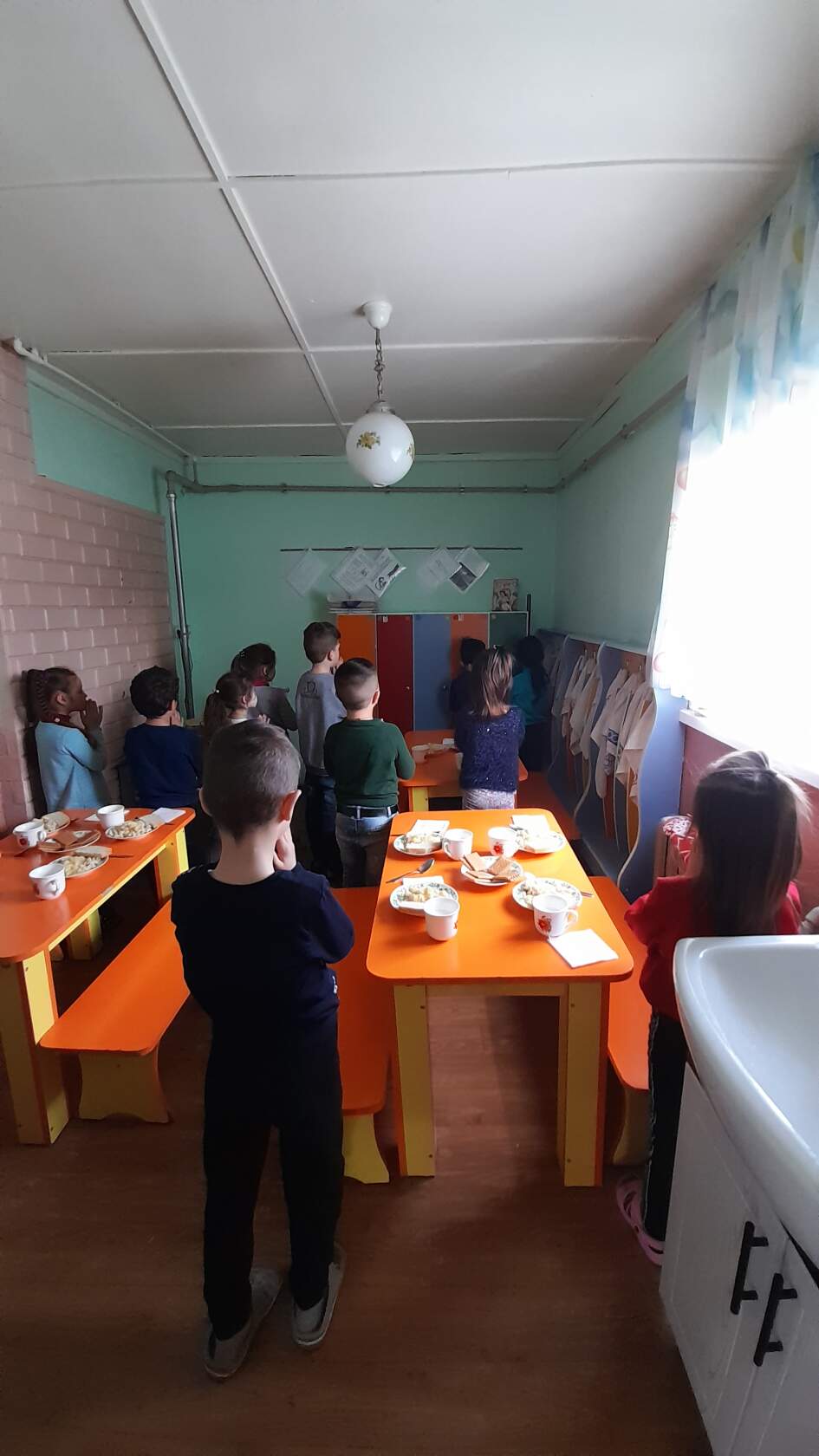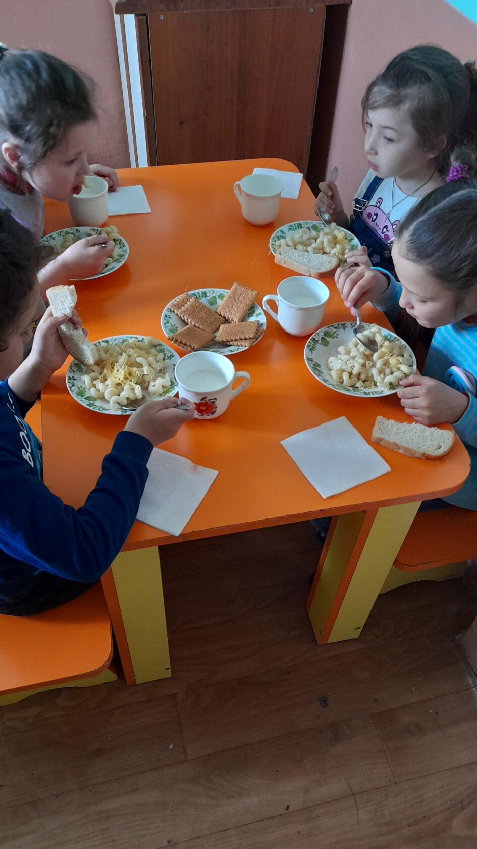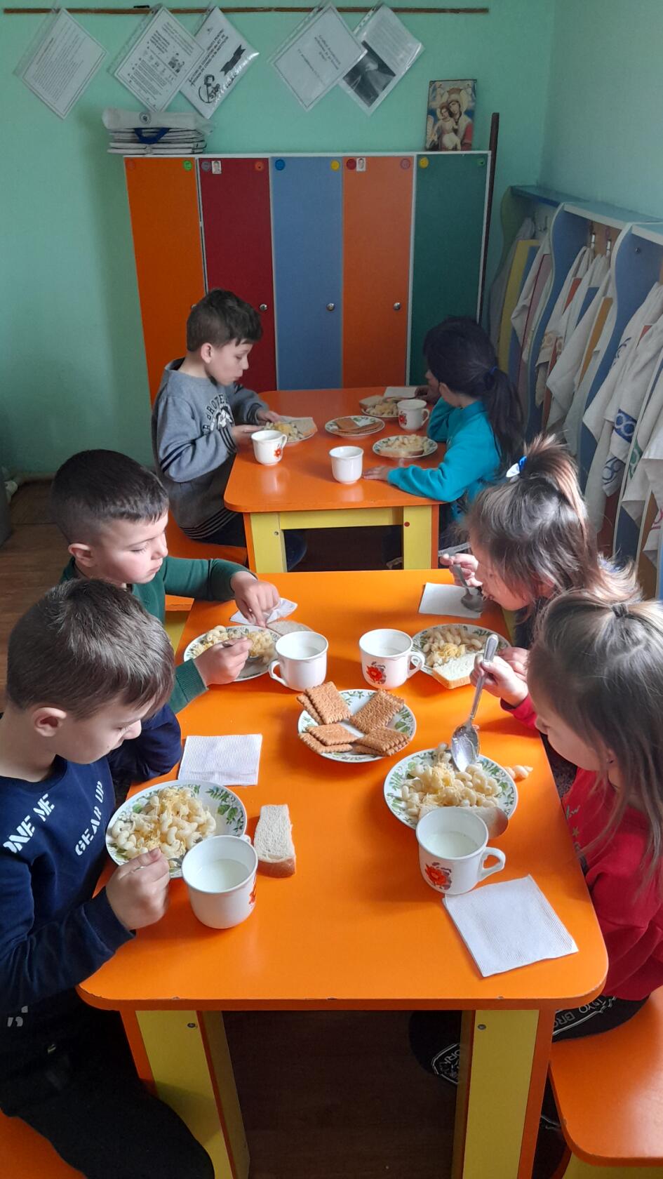 După ce și-au făcut igiena mâinilor copilașii grupei ,,Îngerașii,, spun rugăciunea ,,Tatăl nostru,, apoi servesc cu mare plăcere din toate bucatele preparate pentru ei de doamnele bucătărese.